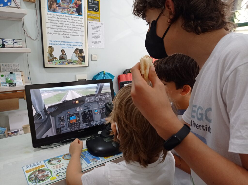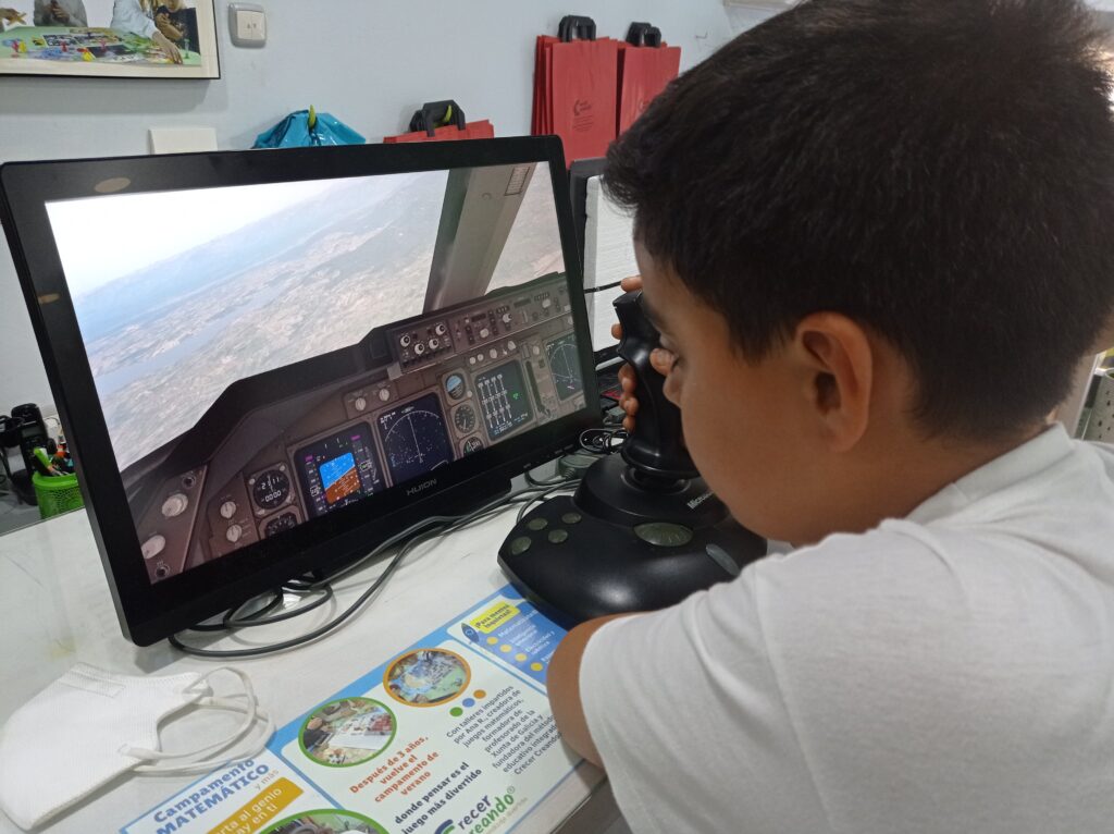 Merendamos y llegó el momento más esperado: usar el simulador de vuelo. Ahora que comprendíamos las fuerzas que movían el avión y sabíamos hacer los cálculos, era hora de elevar el vuelo aplicando lo que habíamos aprendido sobre sustentación, peso, empuje y resistencia.