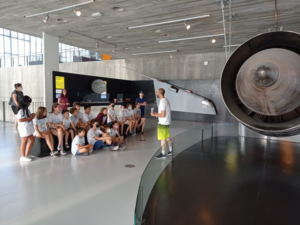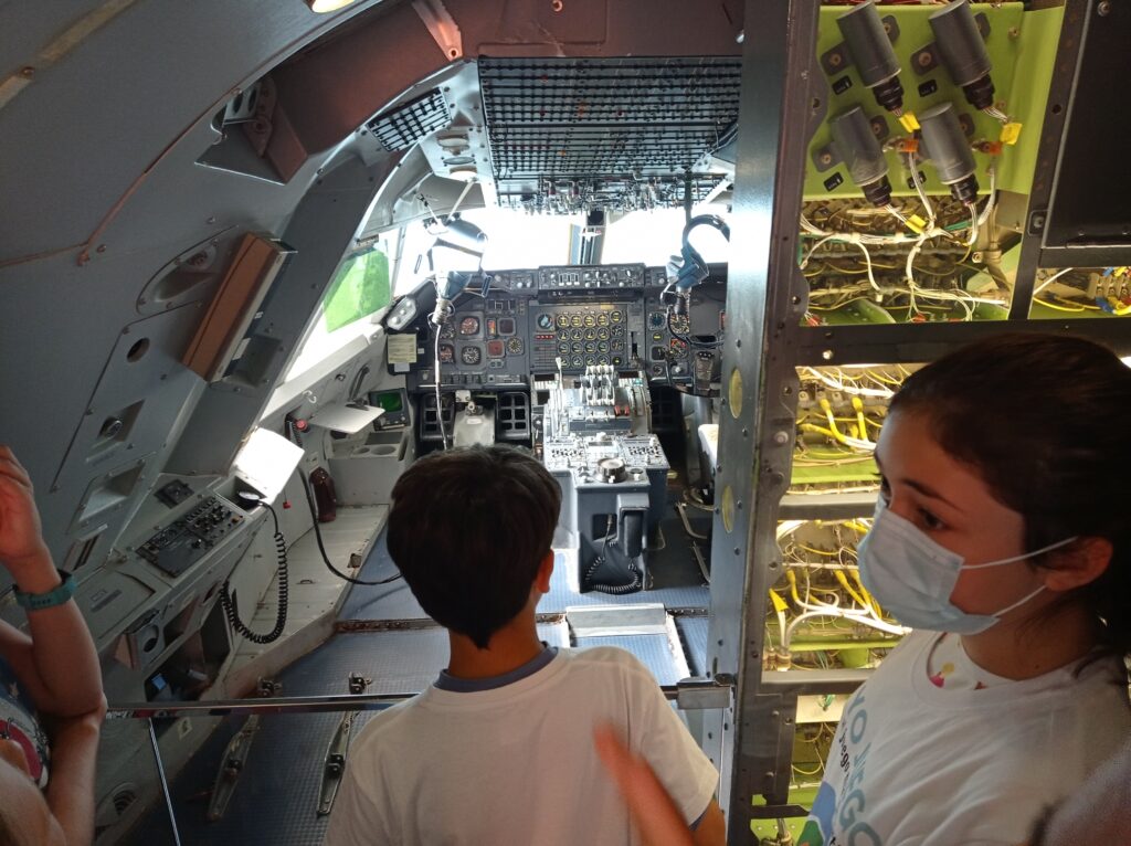 En mitad de la visita, nos detuvimos en la sala de Iberia, donde se encuentran expuestos la parte delantera y el tren de aterrizaje de un Boeing 747, una sección de ala, el radar y una de las cuatro turbinas de las que disponía. Allí Miguel resolvió nuestras dudas sobre aviones y nos explicó la función de los distintos instrumentos del panel de control del piloto.