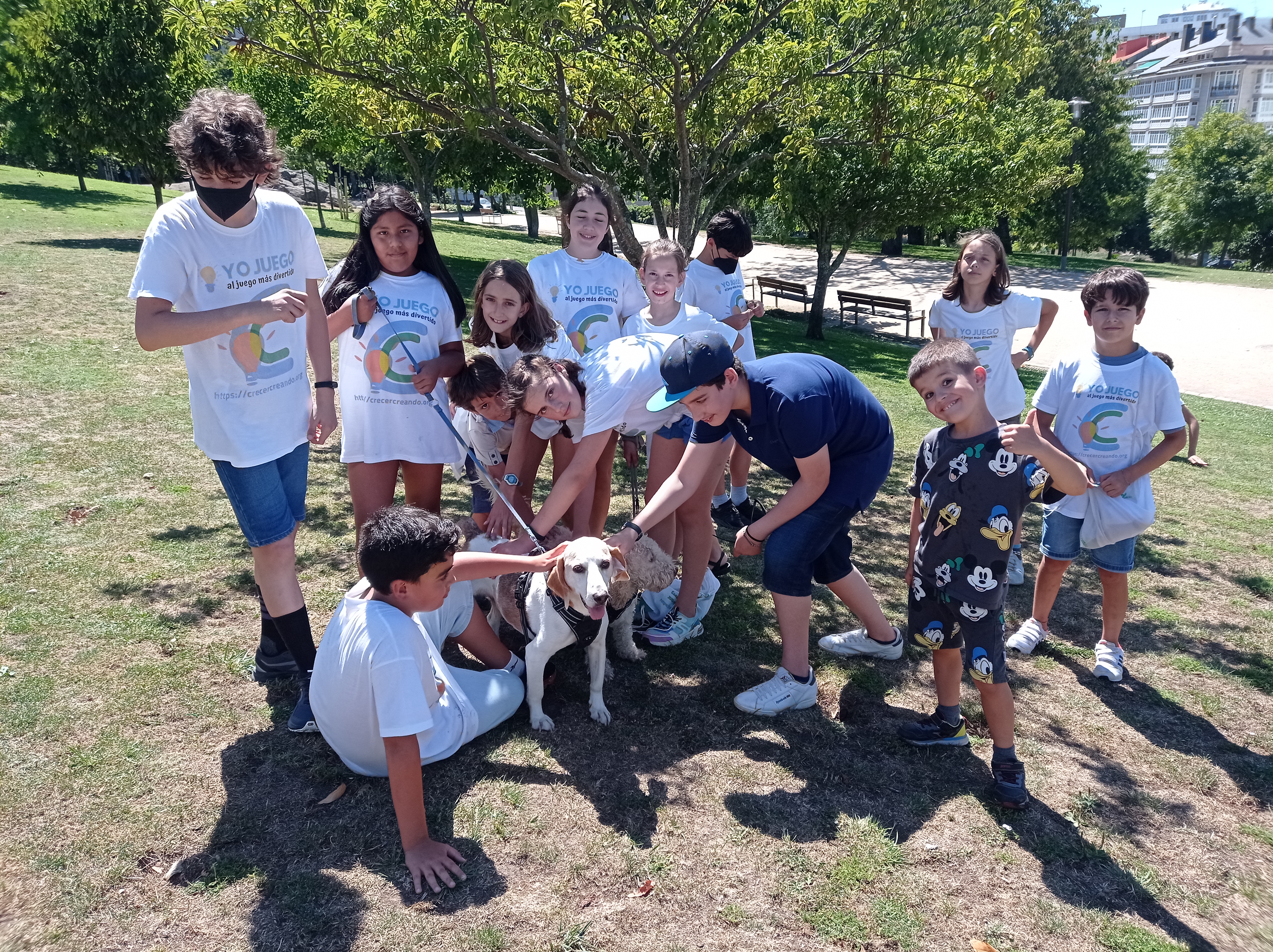 Después de recoger y reciclar entre todos, compartimos 30 minutos al aire libre con Nemo, el perro de Crecer Creando, y Max y Kira, su manada, todos perros rescatados. Nemo estaba muy feliz por volver a ver a los niños y niñas. Aprovechamos para hablar sobre el respeto a todos los seres vivos.