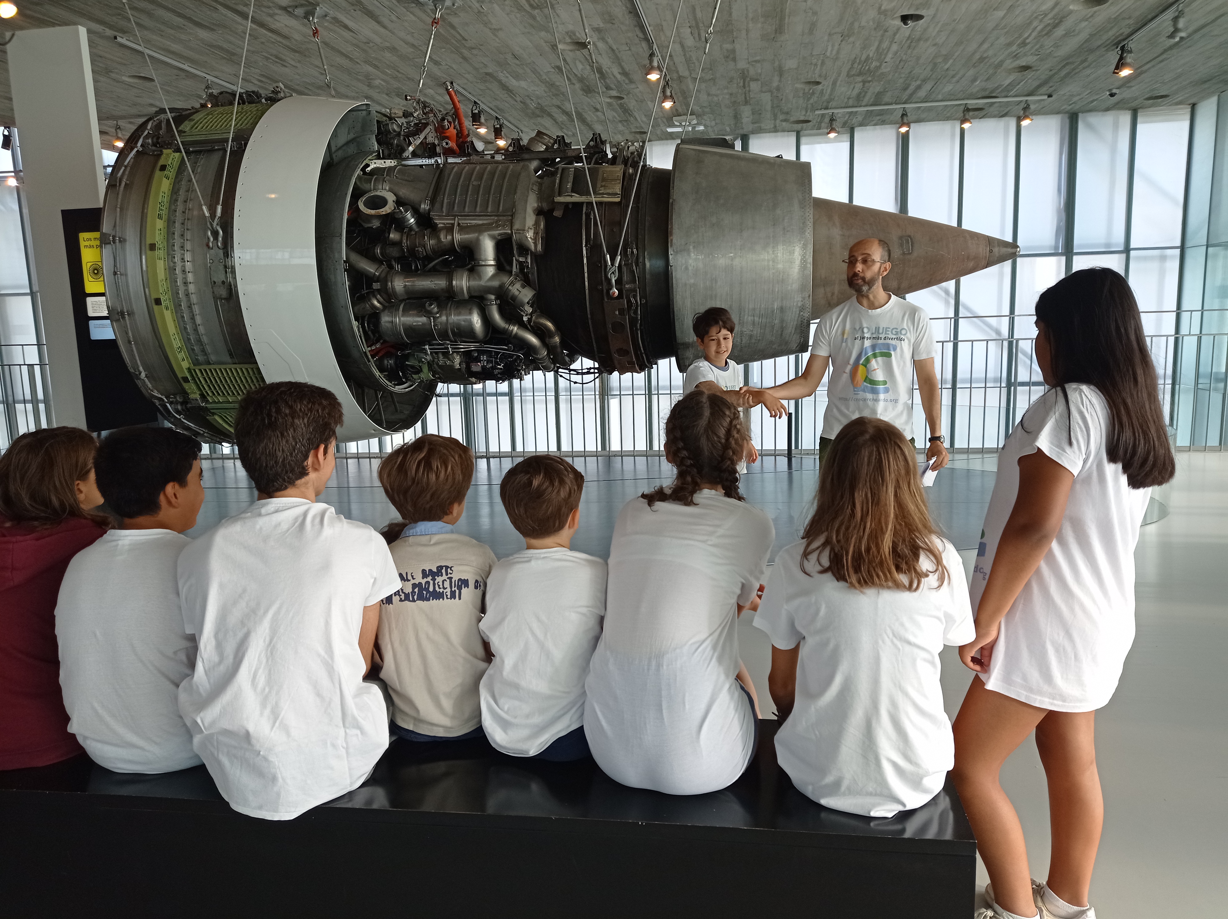 En mitad de la visita, nos detuvimos en la sala de Iberia, donde se encuentran expuestos la parte delantera y el tren de aterrizaje de un Boeing 747, una sección de ala, el radar y una de las cuatro turbinas de las que disponía. Allí Miguel resolvió nuestras dudas sobre aviones y nos explicó la función de los distintos instrumentos del panel de control del piloto.